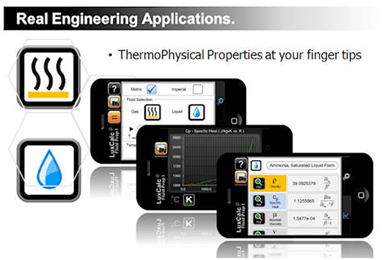 Allows engineers to calculate thermophysical properties of common fluids within an accuracy of 5%. Great for thermal analysis, this app can give you data for any given temperature found in heat transfer books such as specific heat, viscosity (both absolute and dynamic), thermal expansion, etc. The app is small in size and costs only $0.99.